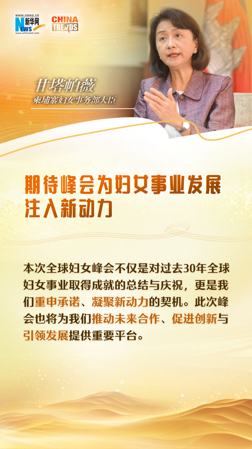 世界妇女峰会将于10月13日至14日在北京举行,备受国际社会关注。 “本届世界妇女峰会不仅总结和庆祝30年来全球妇女事业取得的成就,也是我们重申承诺、获得新动力的机会。”柬埔寨妇女事务部长甘塔帕维在峰会前夕接受新华社专访时表示,峰会将成为各国深化未来合作、培育创新、引领发展的重要平台。他表示,中国在促进妇女权益保护方面取得了巨大进步。柬埔寨希望同中方加强合作,共同促进妇女事业发展,也希望南南合作为妇女在不同领域的发展提供更大空间。策划:车玉明 刘嘉文 统筹:杨定度 董晓娇 执行:田明 赵一申 导演:朱静 陈艳艳 记者:吴长伟 视频制作:王硕 苏雨诗 视觉设计:魏新月 制作:新华海外传播中心相关产品